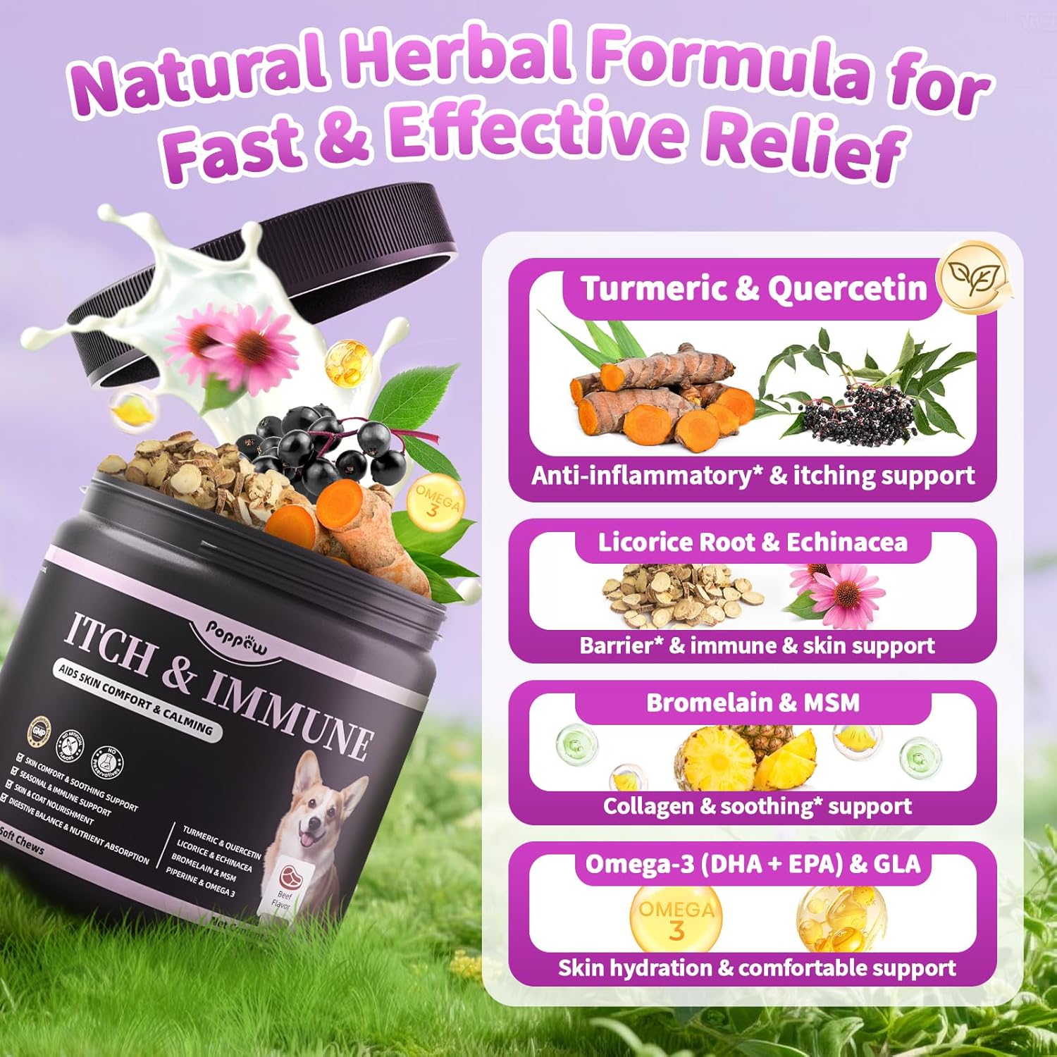 - Skin Comfort & Soothing Care – Our dog allergy chews are formulated with turmeric and quercetin to help maintain skin comfort, ease occasional itching, and support dogs’ sensitive skin when challenged by scratching