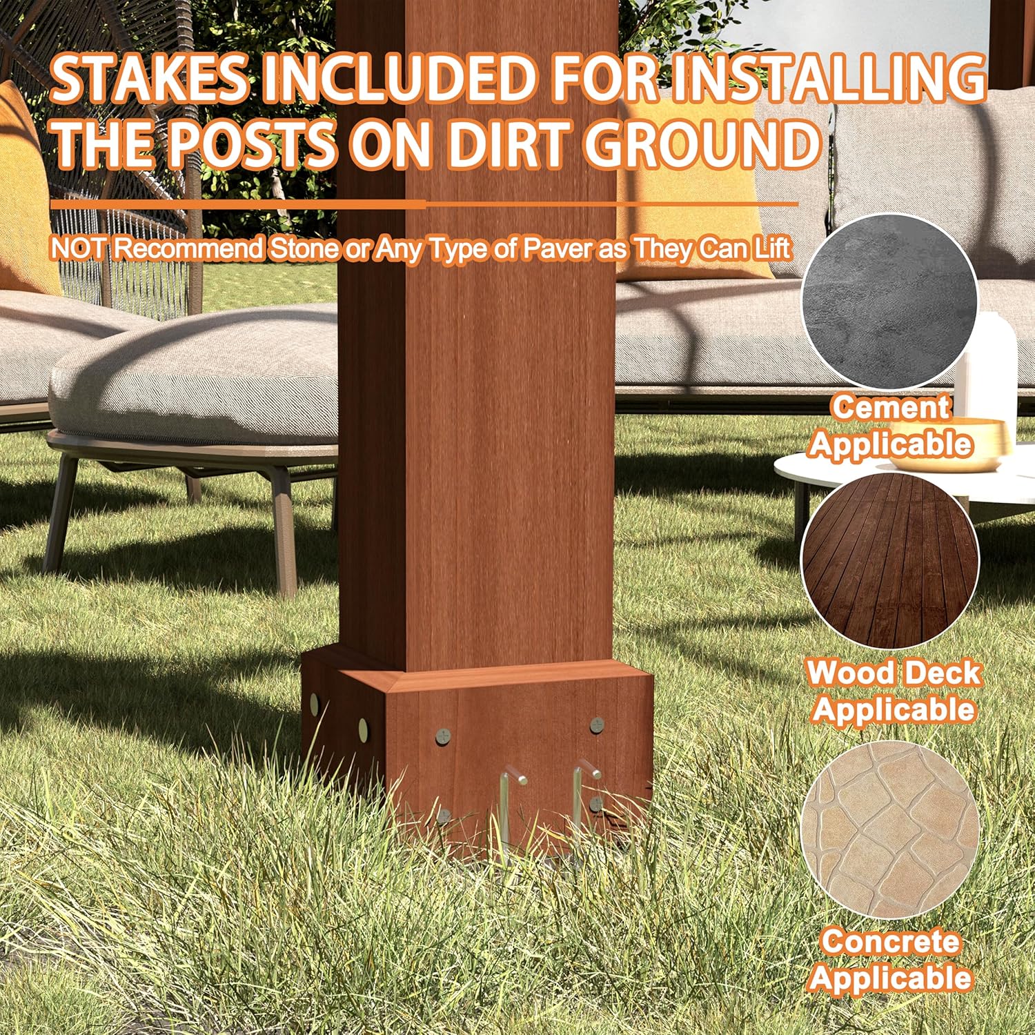 - Strong Stability: This pergola pavilion features ground piles for added stability, allowing you to secure it to various surfaces such as cement, concrete, or wood decks. Perfect for patios, backyards, and more, itβs ideal for hosting outdoor gatherings, relaxing in the shade, or having afternoon tea.