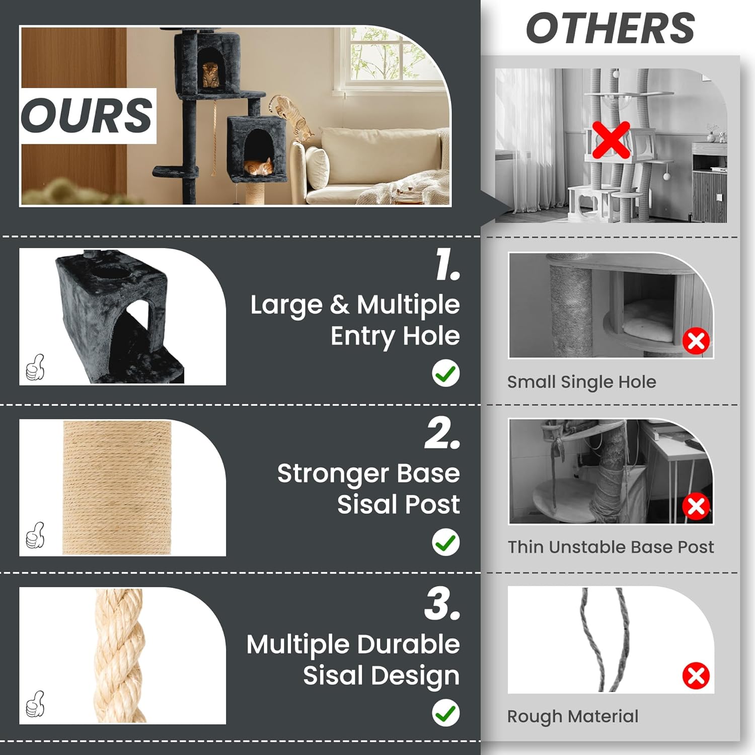 - πΎ[Spacious and comfortable Design]: 59 inch ultra large size cat tree, equipped with two independent cat condos, providing ample space for multiple cats to move and rest.